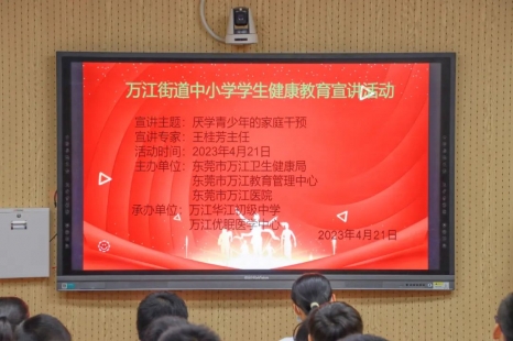 ?為貫徹落實《“健康中國 2030”規劃綱要》《健康中國行動(2019-2030 年)》《“健康廣東 2030”規劃》《健康廣東行動(2019--2030 年)》等文件精神,重點解決青少年最關心、最盼望、最亟需解決的青年健康和成長發展問題,通過開展健康教育宣講活動,以深入學校宣傳全民健康生活方式的行動,普及健康素養基本知識,提高轄區內中小學生健康知識水平及健康教育從業人員相關理論水平,推動萬江街道衛生健康事業高質量發展,4月21日下午,由萬江街道衛生健康局、東莞市萬江教育管理中心、東莞市萬江醫院主辦,東莞優眠醫學中心、萬江華江初級中學聯合協辦的萬江街道中小學學生健康教育宣講活動順利開展。